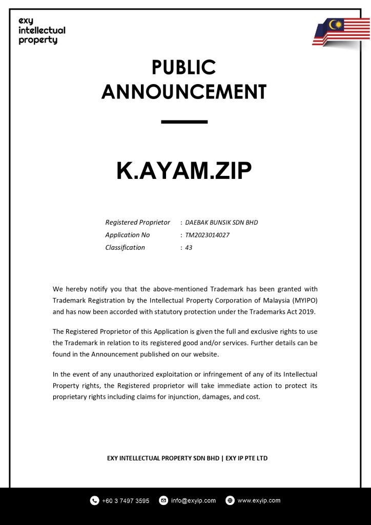 We hereby notify you that the above-mentioned Trademark has been granted with Trademark Registration by the Intellectual Property Corporation of Malaysia (MYIPO) and has now been accorded with statutory protection under the Trademarks Act 2019.
