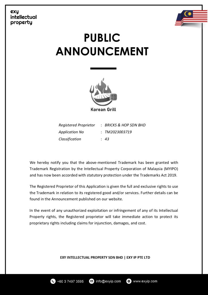 We hereby notify you that the above-mentioned Trademark has been granted with Trademark Registration by the Intellectual Property Corporation of Malaysia (MYIPO) and has now been accorded with statutory protection under the Trademarks Act 2019.