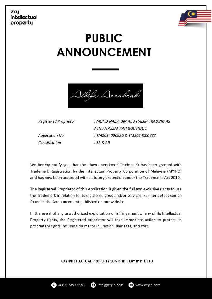 Registered Proprietor : MOHD NAZRI BIN ABD HALIM TRADING AS ATHIFA AZZAHRAH BOUTIQUE                                                                                                                                                    Application Number : TM2024006826 & TM2024006827                                                                  Â