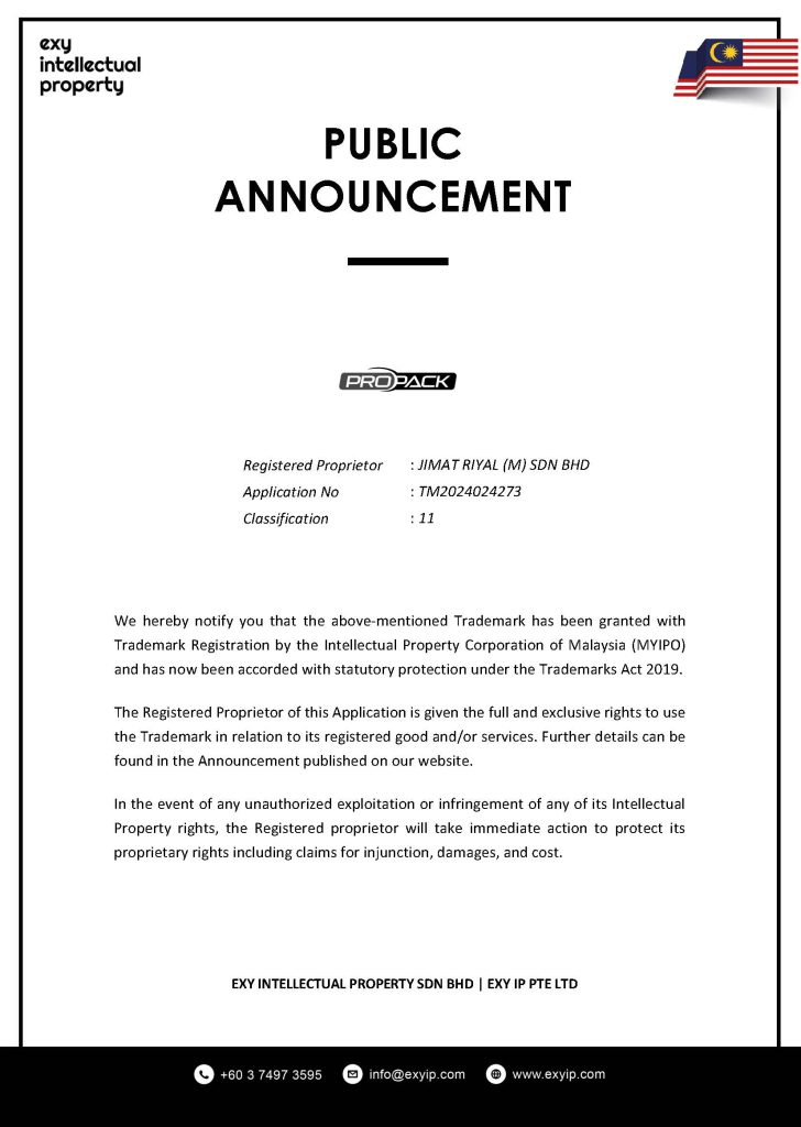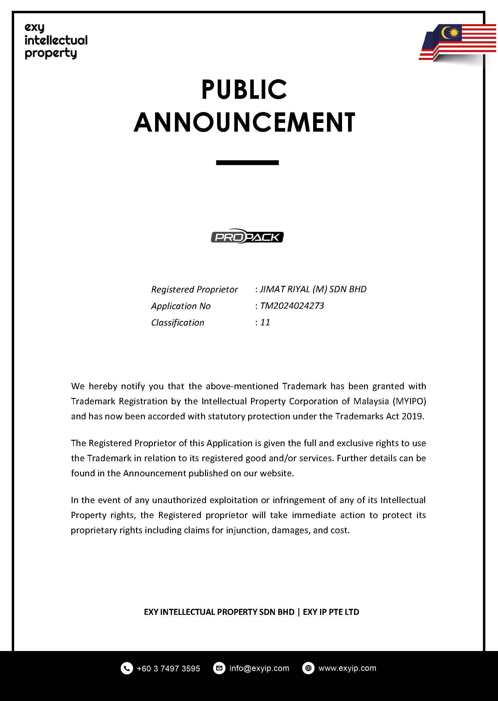 We hereby notify you that the above-mentioned Trademark has been granted with Trademark Registration by the Intellectual Property Corporation of Malaysia (MYIPO) and has now been accorded with statutory protection under the Trademarks Act 2019.