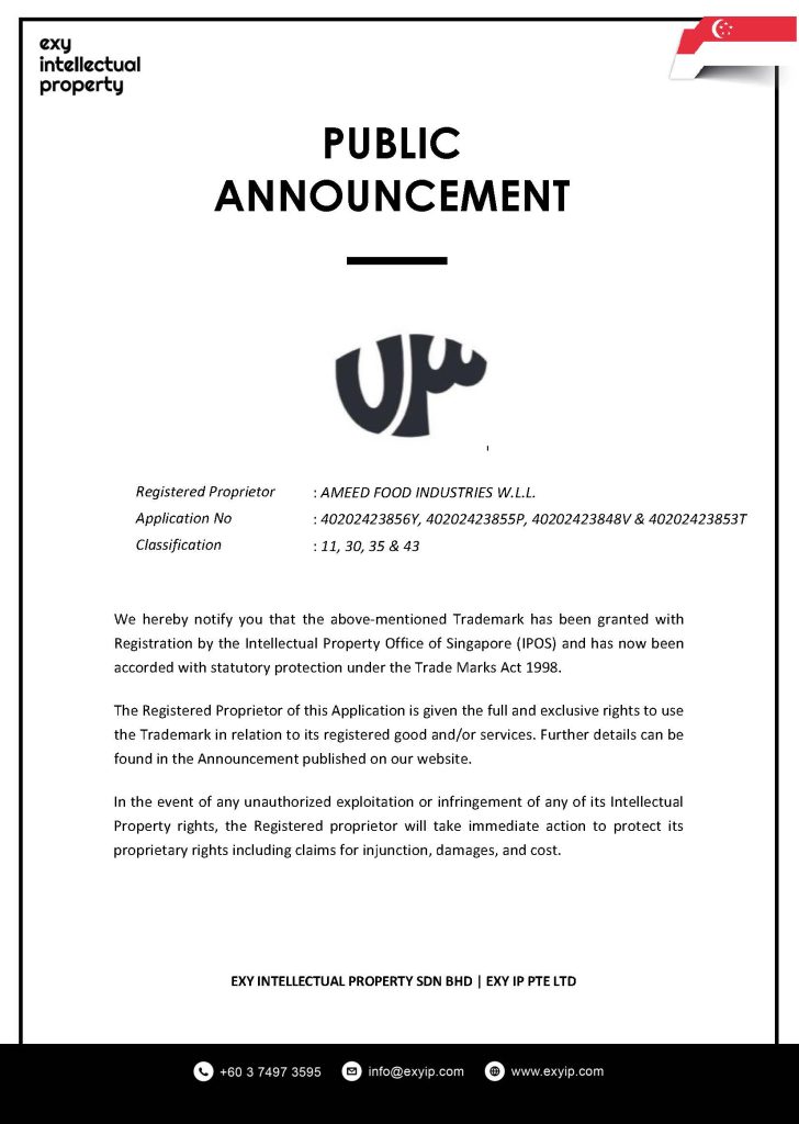 We hereby notify you that the above-mentioned Trademark has been granted with Registration by the Intellectual Property Office of Singapore (IPOS) and has now been accorded with statutory protection under the Trade Marks Act 1998.