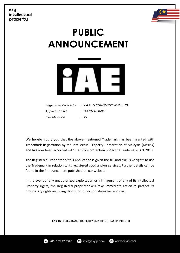 Registered Proprietor : I.A.E. TECHNOLOGY SDN. BHD.                                                              Â