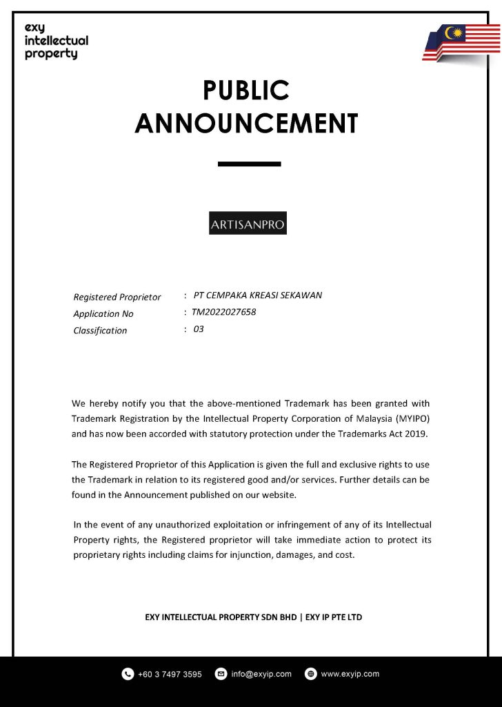 We hereby notify you that the above-mentioned Trademark has been granted with Trademark Registration by the Intellectual Property Corporation of Malaysia (MYIPO) and has now been accorded with statutory protection under the Trademarks Act 2019.