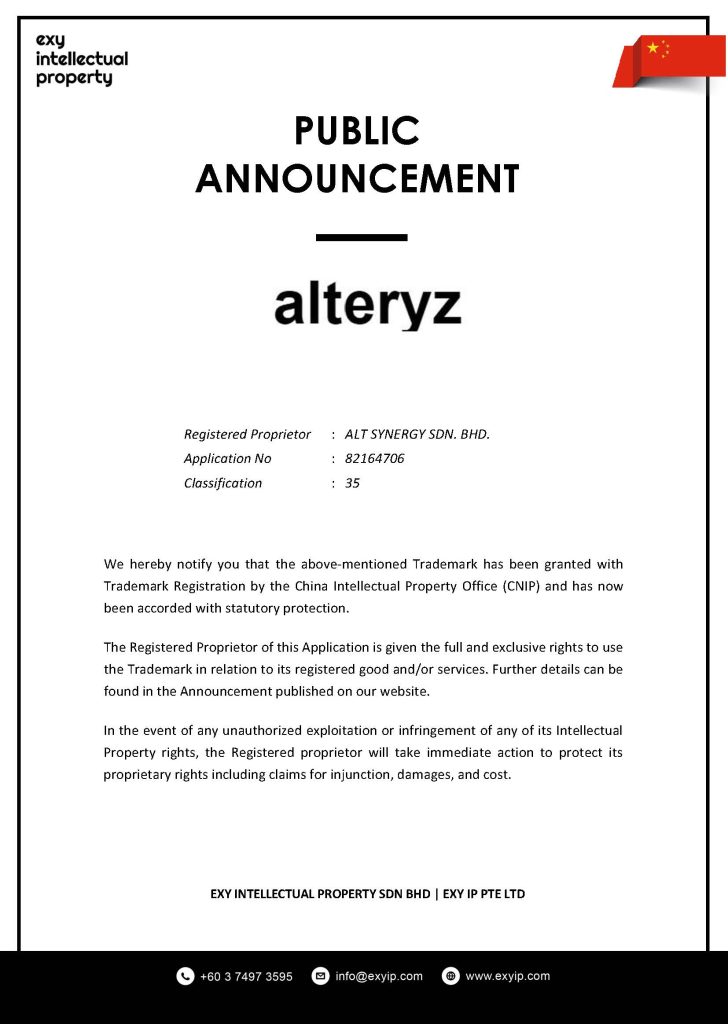 Registered Proprietor : ALT SYNERGY SDN. BHD.