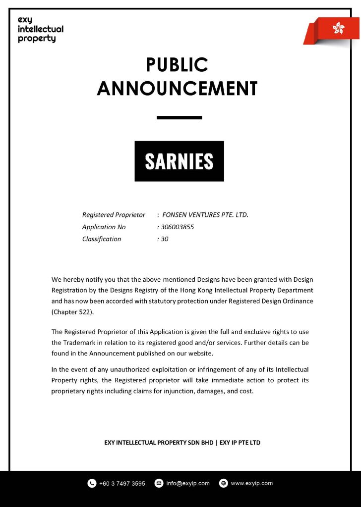 We hereby notify you that the above-mentioned Designs have been granted with Design Registration by the Designs Registry of the Hong Kong Intellectual Property Department and has now been accorded with statutory protection under Registered Design Ordinance (Chapter 522).