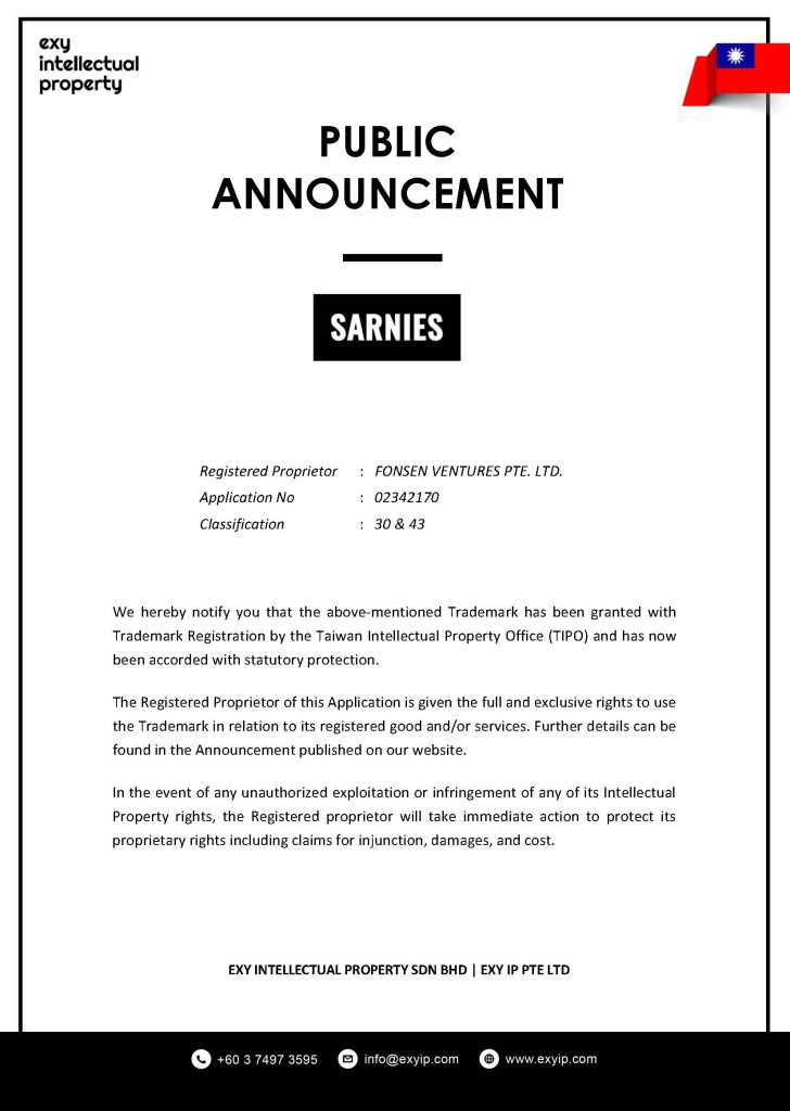 We hereby notify you that the above-mentioned Trademark has been granted with Trademark Registration by the Taiwan Intellectual Property Office (TIPO) and has now been accorded with statutory protection.