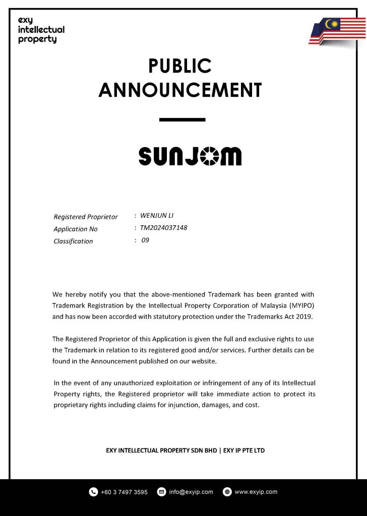 We hereby notify you that the above-mentioned Trademark has been granted with Trademark Registration by the Intellectual Property Corporation of Malaysia (MYIPO) and has now been accorded with statutory protection under the Trademarks Act 2019.