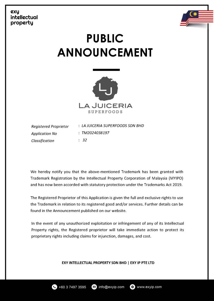 Registered Proprietor : LA JUICERIA SUPERFOODS SDN BHD