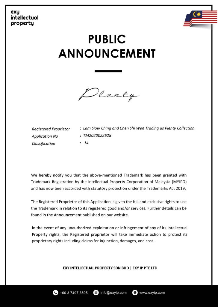 Registered Proprietor : Lam Siow Ching and Chen Shi Wen Trading as Plenty Collection