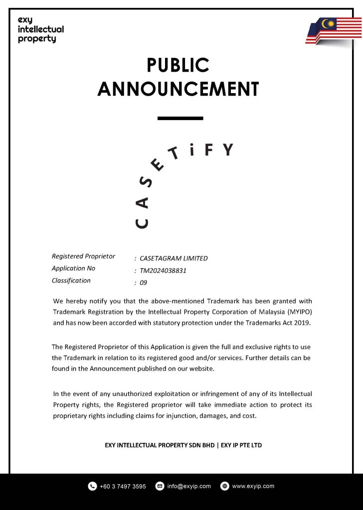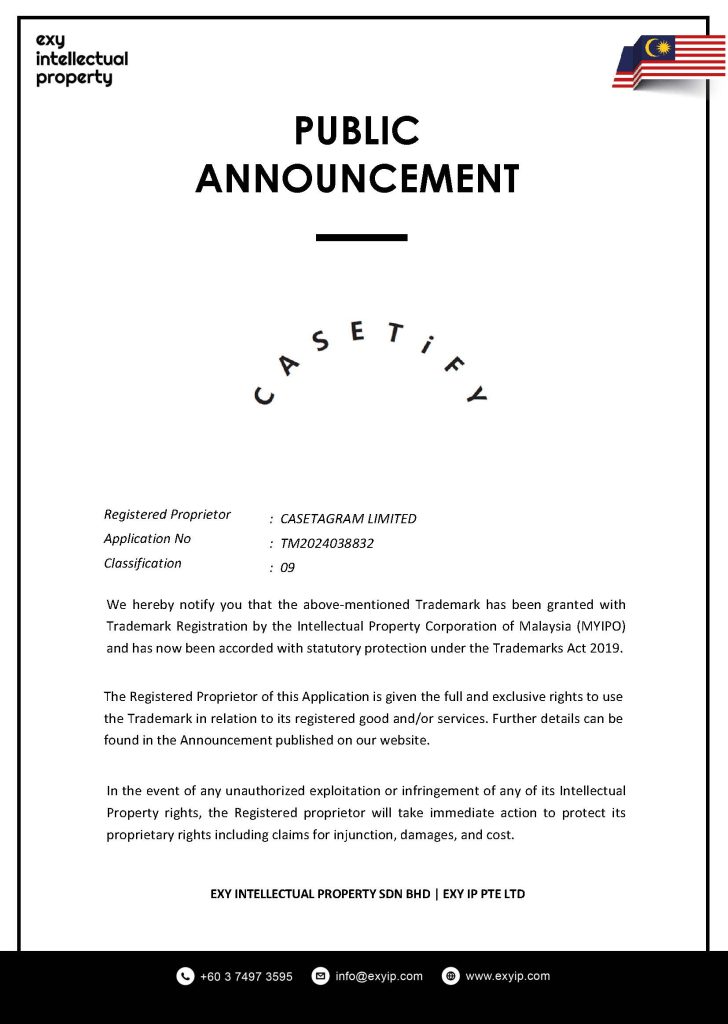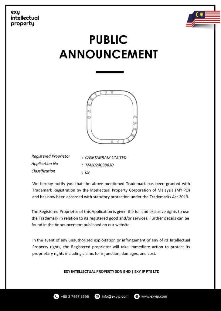 We hereby notify you that the above-mentioned Trademark has been granted with Trademark Registration by the Intellectual Property Corporation of Malaysia (MYIPO) and has now been accorded with statutory protection under the Trademarks Act 2019.