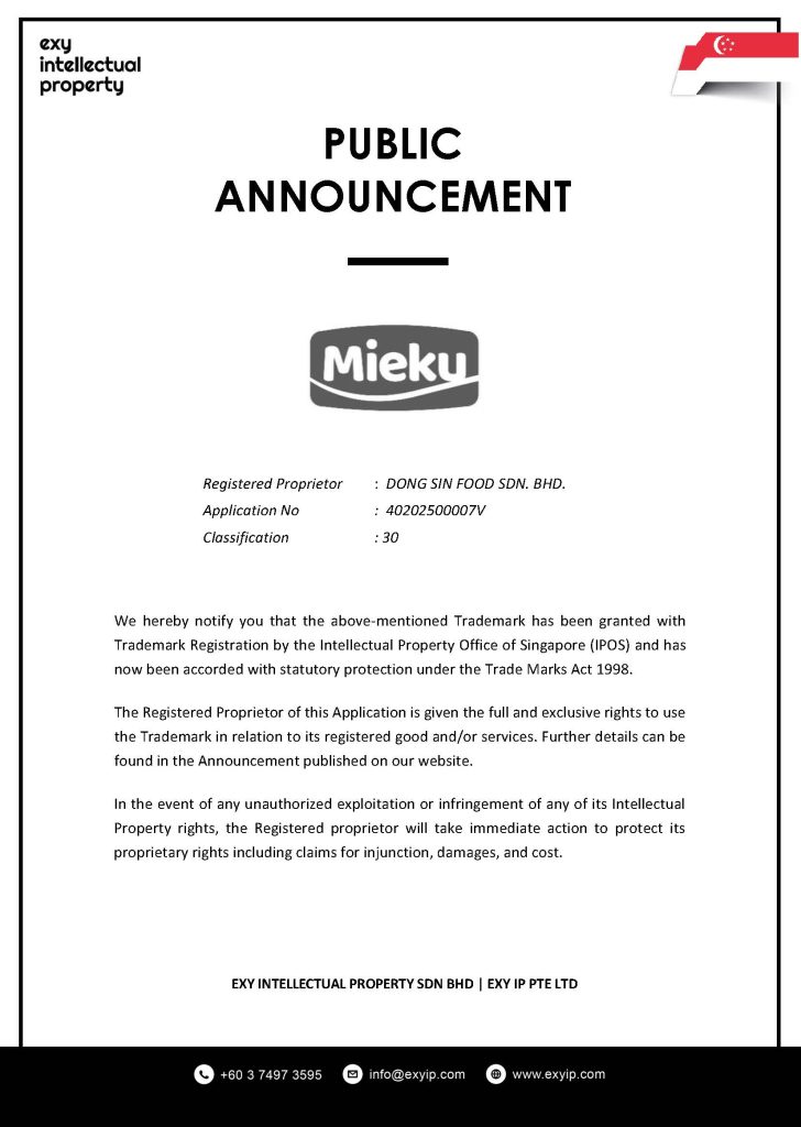 Agent :Â EXY IP PLT, LOT 2928 & 2929, JALAN PJS 3/1, BANDAR PETALING JAYA SELATAN PETALING JAYA 46000 SELANGOR, MALAYSIA