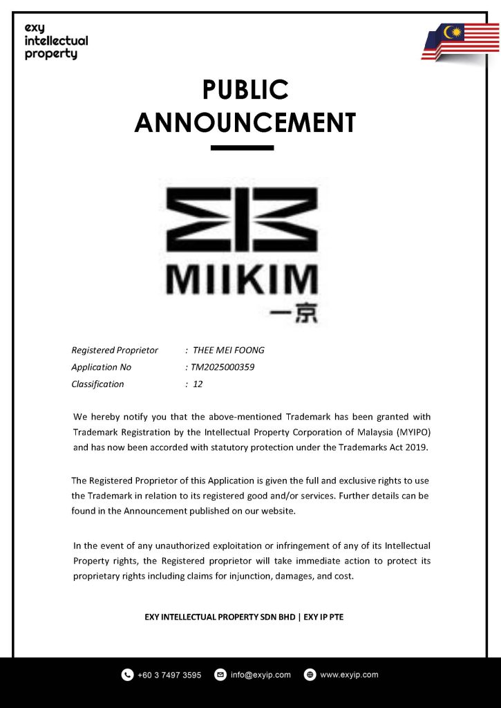 We hereby notify you that the above-mentioned Trademark has been granted with Trademark Registration by the Intellectual Property Corporation of Malaysia (MYIPO) and has now been accorded with statutory protection under the Trademarks Act 2019.