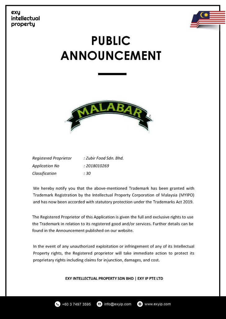 We hereby notify you that the above-mentioned Trademark has been granted with Trademark Registration by the Intellectual Property Corporation of Malaysia (MYIPO) and has now been accorded with statutory protection under the Trademarks Act 2019.
