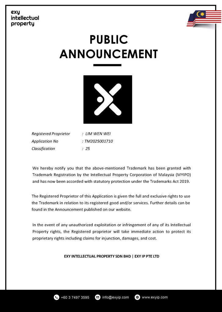 We hereby notify you that the above-mentioned Trademark has been granted with Trademark Registration by the Intellectual Property Corporation of Malaysia (MYIPO) and has now been accorded with statutory protection under the Trademarks Act 2019.