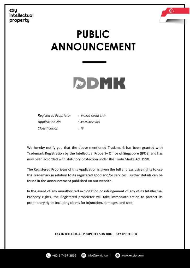 We hereby notify you that the above-mentioned Trademark has been granted with Trademark Registration by the Intellectual Property Office of Singapore (IPOS) and has now been accorded with statutory protection under the Trade Marks Act 1998.
