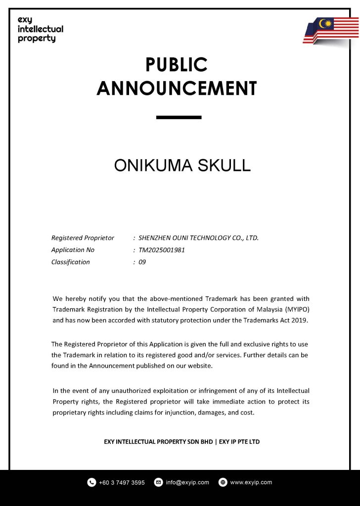 We hereby notify you that the above-mentioned Trademark has been granted with Trademark Registration by the Intellectual Property Corporation of Malaysia (MYIPO) and has now been accorded with statutory protection under the Trademarks Act 2019.