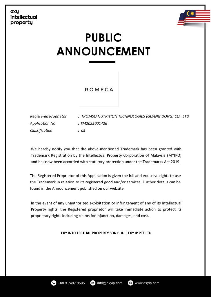 We hereby notify you that the above-mentioned Trademark has been granted with Trademark Registration by the Intellectual Property Corporation of Malaysia (MYIPO) and has now been accorded with statutory protection under the Trademarks Act 2019.