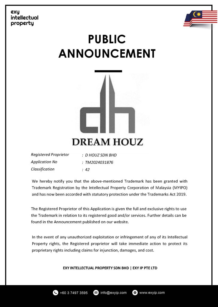 We hereby notify you that the above-mentioned Trademark has been granted with Trademark Registration by the Intellectual Property Corporation of Malaysia (MYIPO) and has now been accorded with statutory protection under the Trademarks Act 2019.