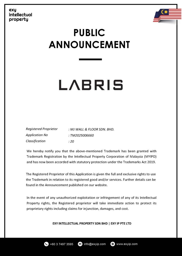 We hereby notify you that the above-mentioned Trademark has been granted with Trademark Registration by the Intellectual Property Corporation of Malaysia (MYIPO) and has now been accorded with statutory protection under the Trademarks Act 2019.