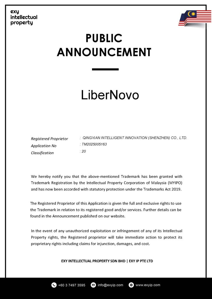 We hereby notify you that the above-mentioned Trademark has been granted with Trademark Registration by the Intellectual Property Corporation of Malaysia (MYIPO) and has now been accorded with statutory protection under the Trademarks Act 2019.