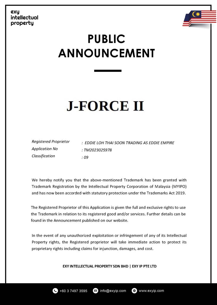 We hereby notify you that the above-mentioned Trademark has been granted with Trademark Registration by the Intellectual Property Corporation of Malaysia (MYIPO) and has now been accorded with statutory protection under the Trademarks Act 2019.