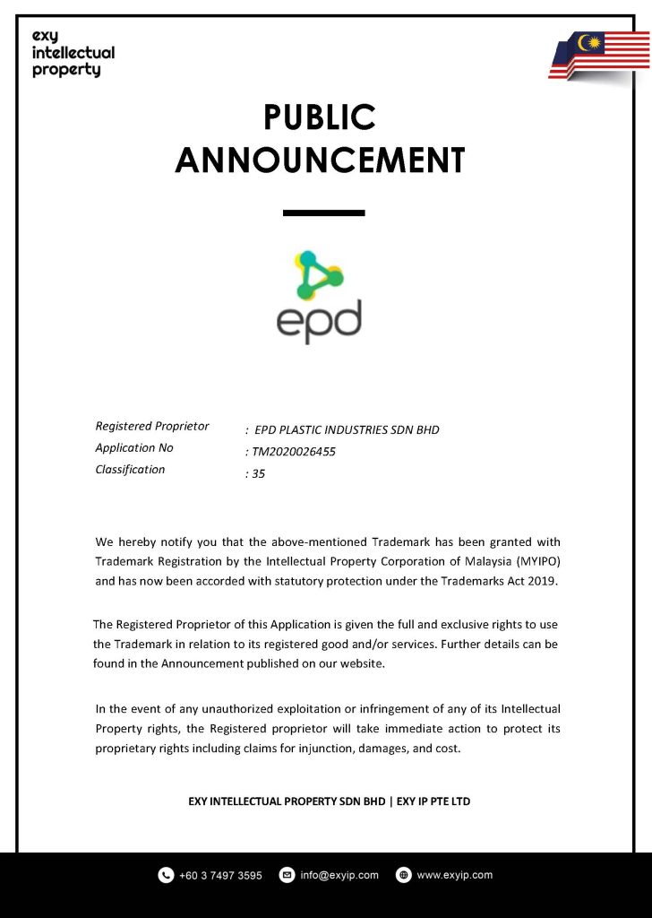 Registered Proprietor : Epd Plastic Industries Sdn Bhd