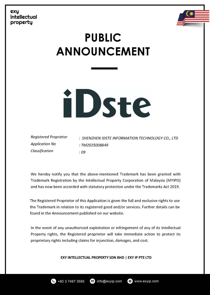 Registered Proprietor : Shenzhen Idste Information Technology Co., Ltd