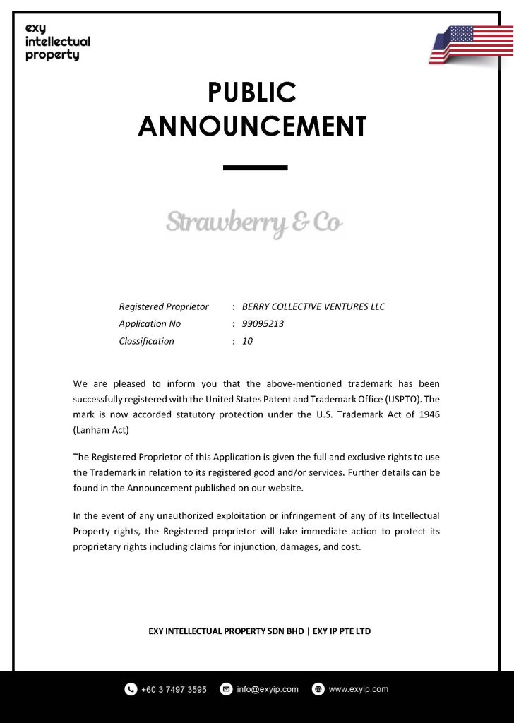 We are pleased to inform you that the above-mentioned trademark has been successfully registered with the United States Patent and Trademark Office (USPTO). The mark is now accorded statutory protection under the U.S. Trademark Act of 1946 (Lanham Act)