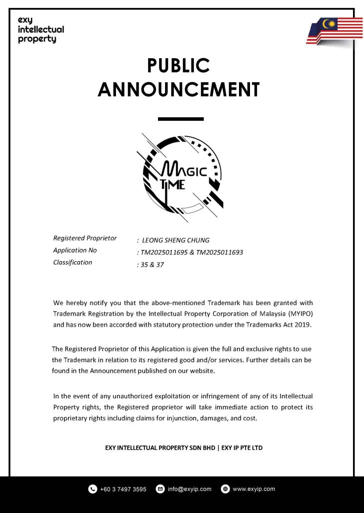 We hereby notify you that the above-mentioned Trademark has been granted with Trademark Registration by the Intellectual Property Corporation of Malaysia (MYIPO) and has now been accorded with statutory protection under the Trademarks Act 2019.