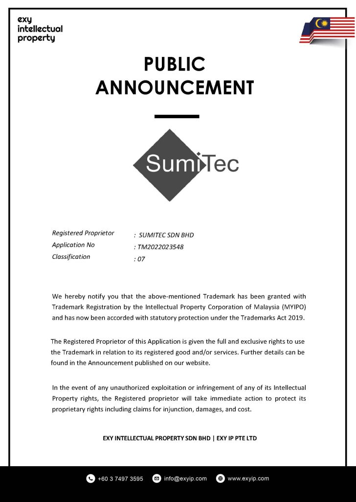 We hereby notify you that the above-mentioned Trademark has been granted with Trademark Registration by the Intellectual Property Corporation of Malaysia (MYIPO) and has now been accorded with statutory protection under the Trademarks Act 2019.
