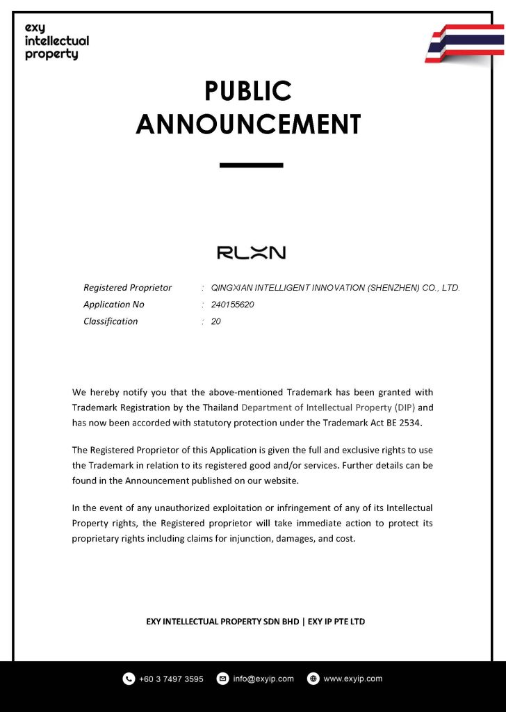 We hereby notify you that the above-mentioned Trademark has been granted with Trademark Registration by the Thailand Department of Intellectual Property (DIP) and has now been accorded with statutory protection under the Trademark Act BE 2534.