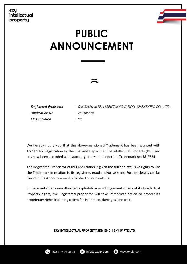 Registered Proprietor : Qingxian Intelligent Innovation (Shenzhen) Co., Ltd.