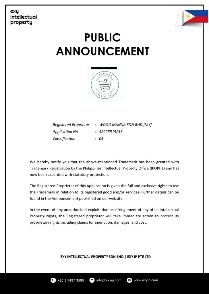 We hereby notify you that the above-mentioned Trademark has been granted with Trademark Registration by the Philippines Intellectual Property Office (IPOPHL) and has now been accorded with statutory protection.