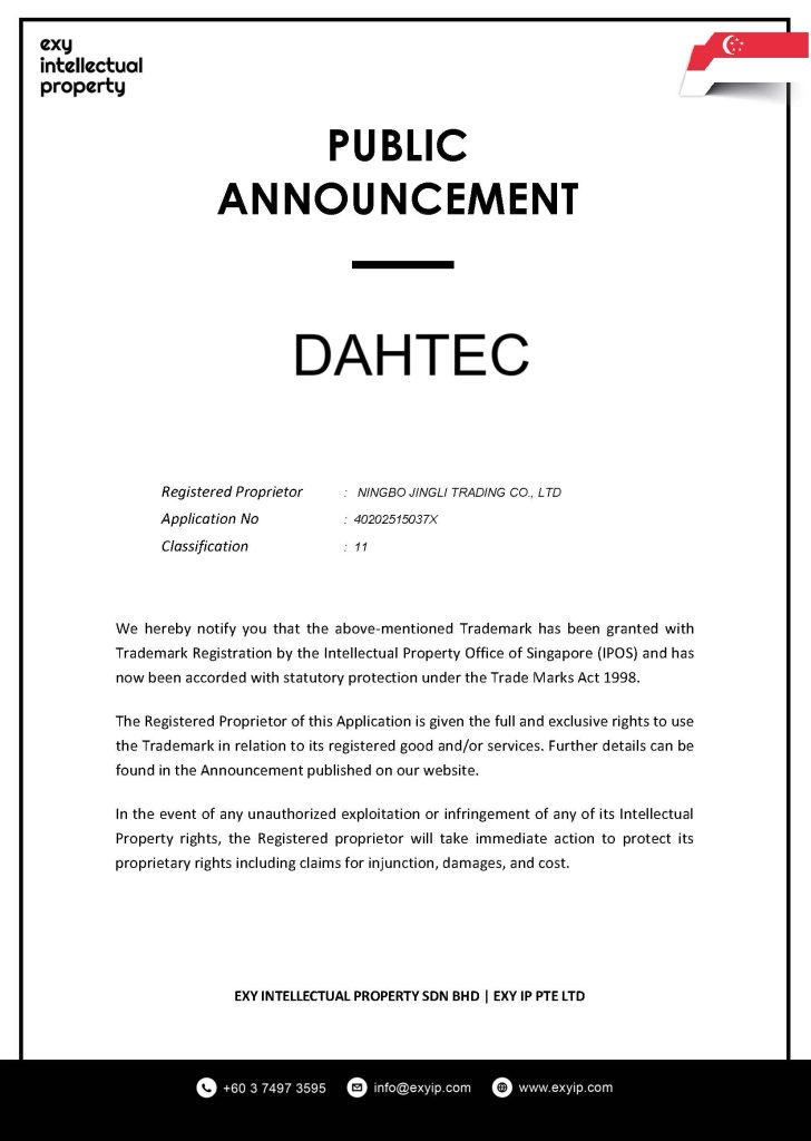 We hereby notify you that the above-mentioned Trademark has been granted with Trademark Registration by the Intellectual Property Office of Singapore (IPOS) and has now been accorded with statutory protection under the Trade Marks Act 1998.