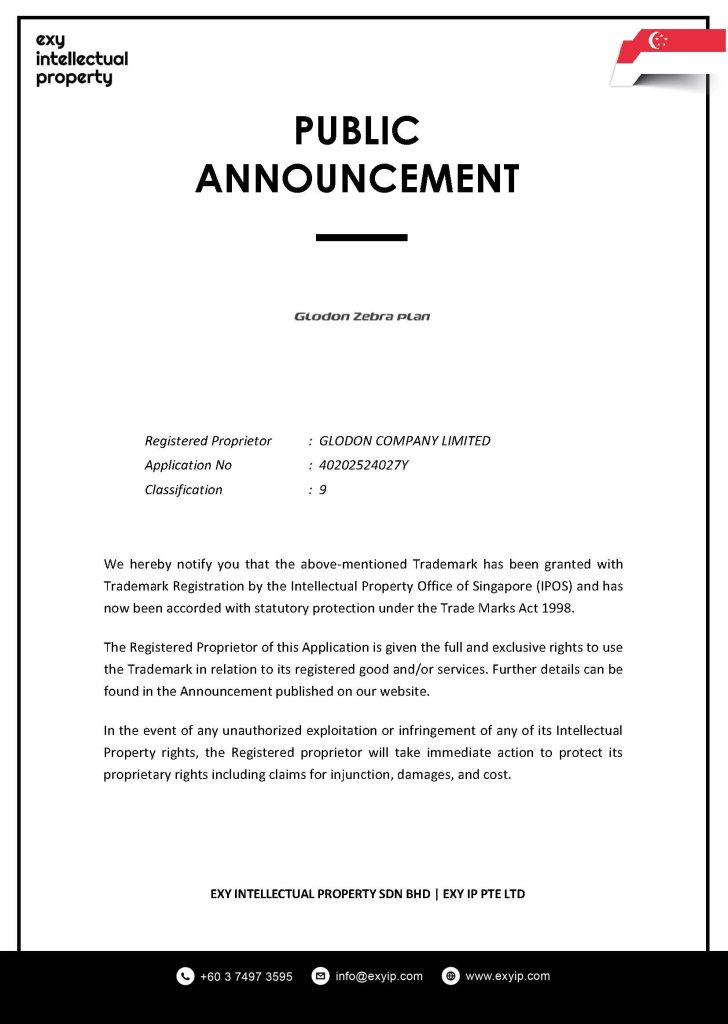 We hereby notify you that the above-mentioned Trademark has been granted with Trademark Registration by the Intellectual Property Office of Singapore (IPOS) and has now been accorded with statutory protection under the Trade Marks Act 1998.