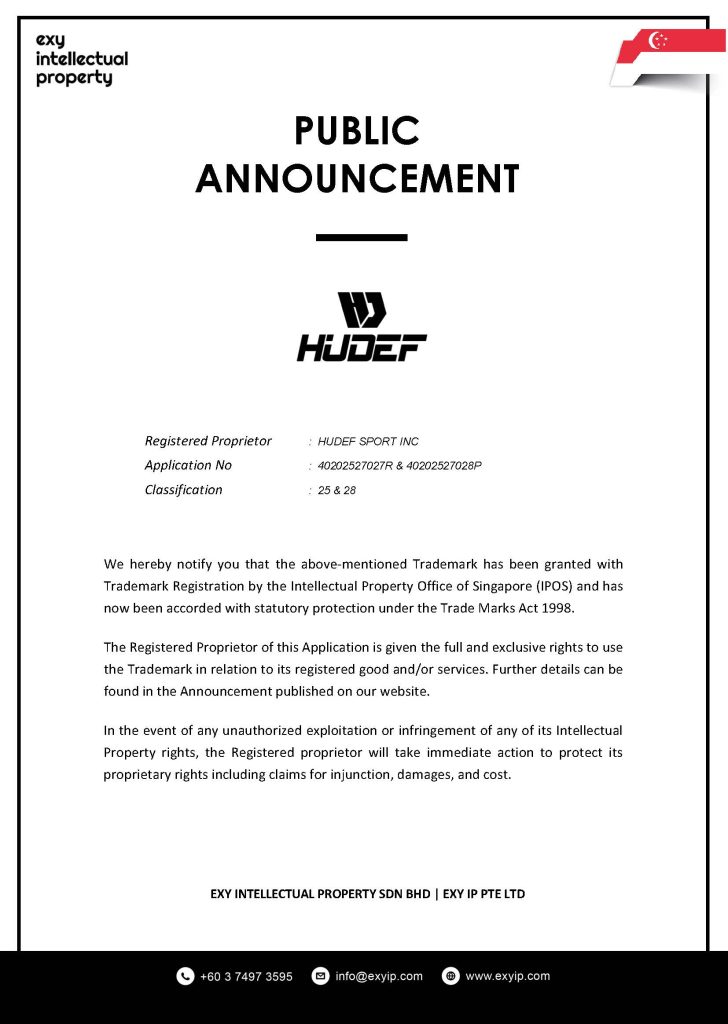 We hereby notify you that the above-mentioned Trademark has been granted with Trademark Registration by the Intellectual Property Office of Singapore (IPOS) and has now been accorded with statutory protection under the Trade Marks Act 1998.