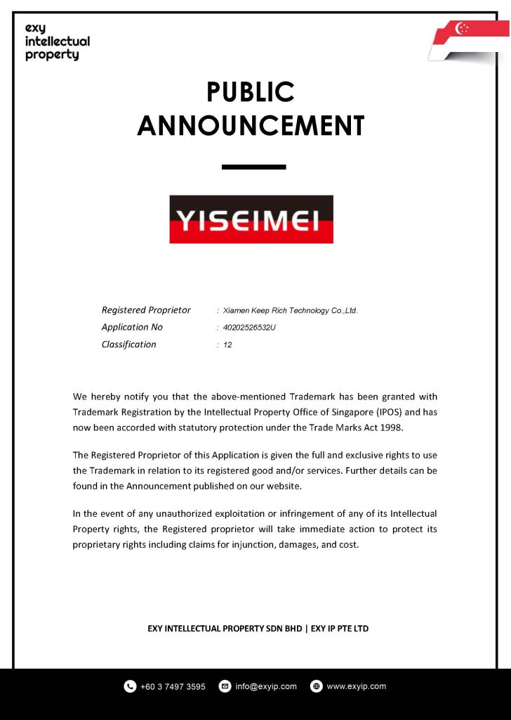 We hereby notify you that the above-mentioned Trademark has been granted with Trademark Registration by the Intellectual Property Office of Singapore (IPOS) and has now been accorded with statutory protection under the Trade Marks Act 1998.