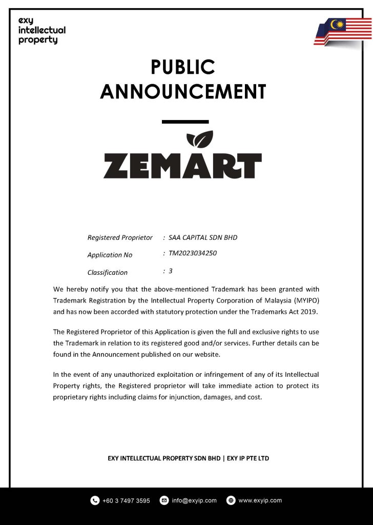 We hereby notify you that the above-mentioned Trademark has been granted with Trademark Registration by the Intellectual Property Corporation of Malaysia (MYIPO) and has now been accorded with statutory protection under the Trademarks Act 2019.