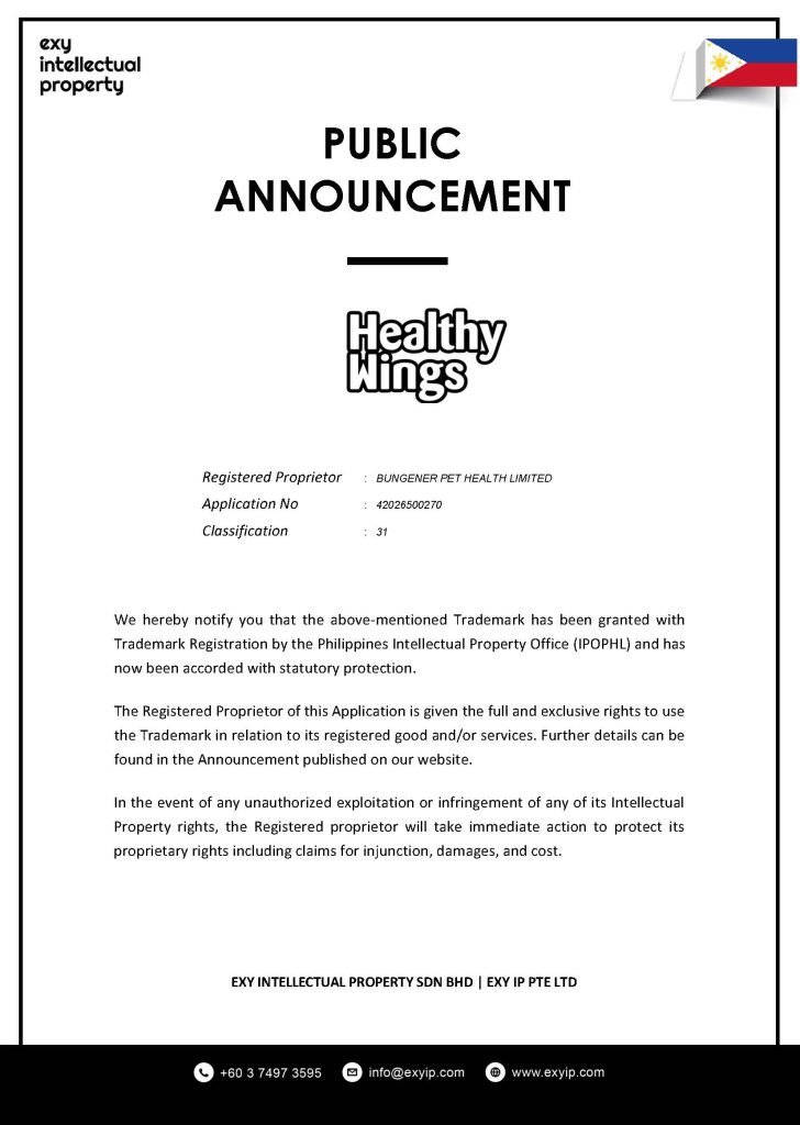 We hereby notify you that the above-mentioned Trademark has been granted with Trademark Registration by the Philippines Intellectual Property Office (IPOPHL) and has now been accorded with statutory protection.