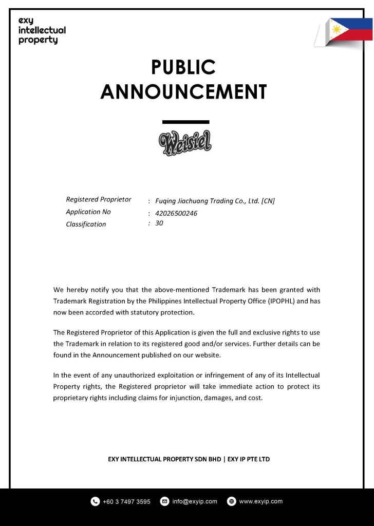 We hereby notify you that the above-mentioned Trademark has been granted with Trademark Registration by the Philippines Intellectual Property Office (IPOPHL) and has now been accorded with statutory protection.