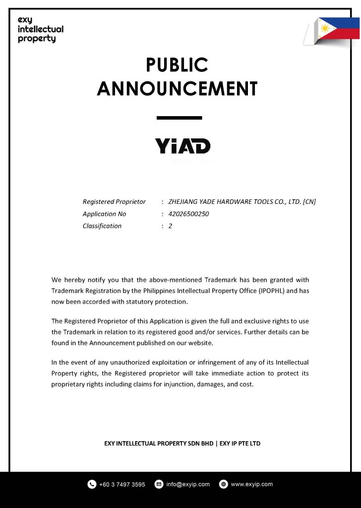 Registered Proprietor : Zhejiang Yade Hardware Tools Co., Ltd. [Cn]