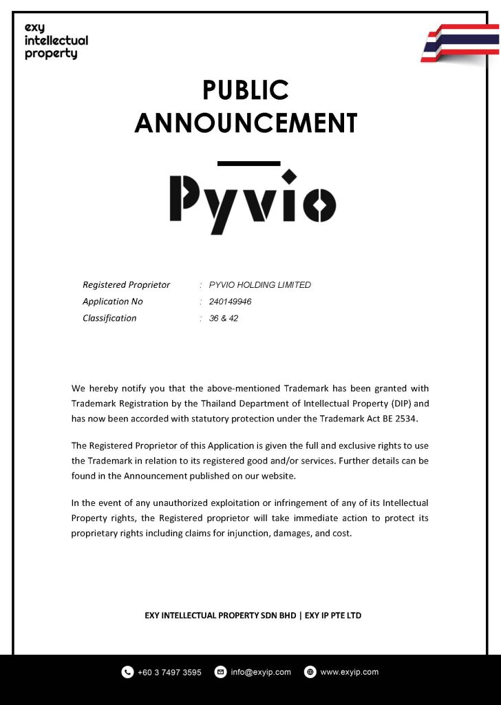 We hereby notify you that the above-mentioned Trademark has been granted with Trademark Registration by the Thailand Department of Intellectual Property (DIP) and has now been accorded with statutory protection under the Trademark Act BE 2534.