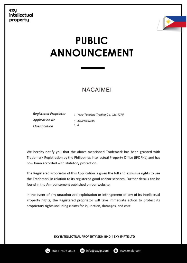 We hereby notify you that the above-mentioned Trademark has been granted with Trademark Registration by the Philippines Intellectual Property Office (IPOPHL) and has now been accorded with statutory protection.
