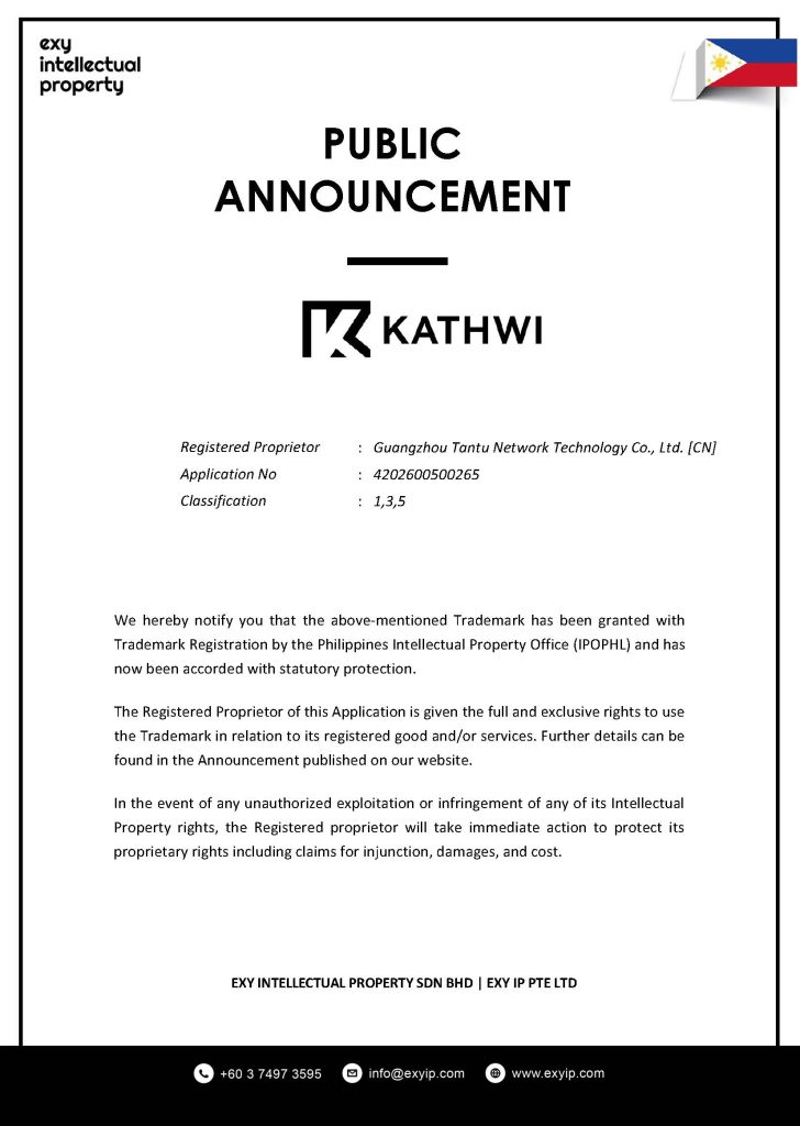 We hereby notify you that the above-mentioned Trademark has been granted with Trademark Registration by the Philippines Intellectual Property Office (IPOPHL) and has now been accorded with statutory protection.
