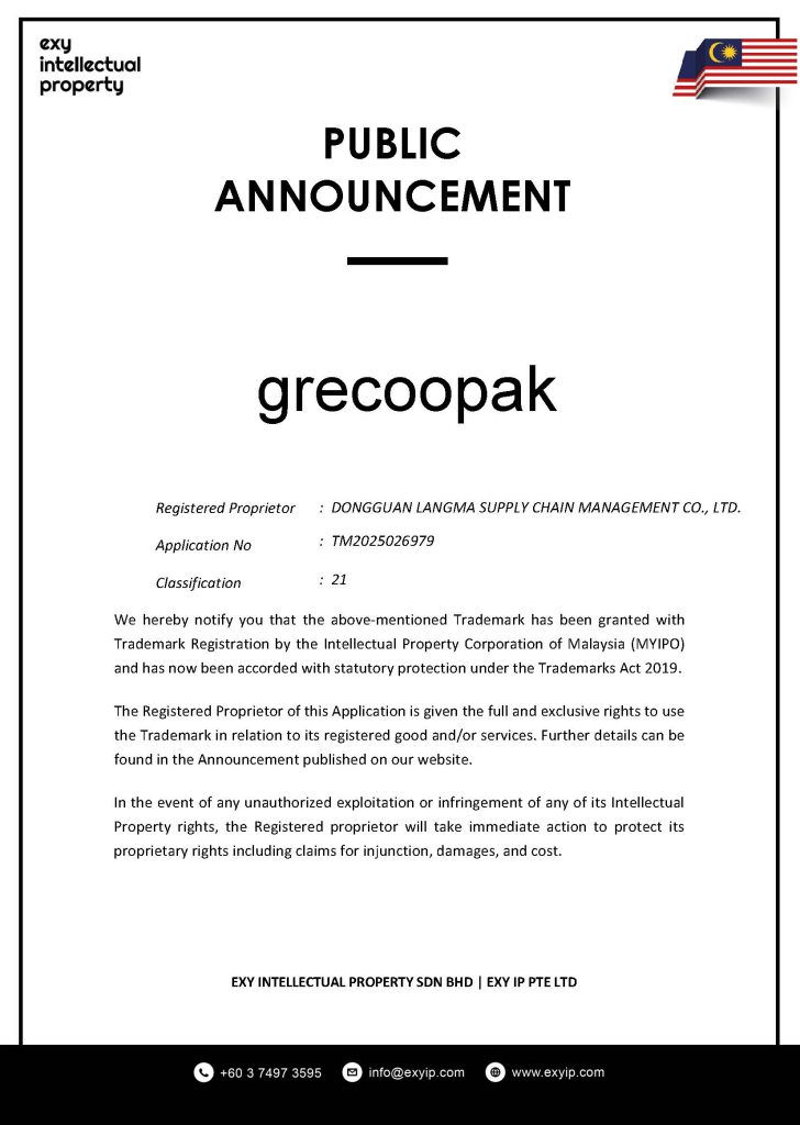 We hereby notify you that the above-mentioned Trademark has been granted with Trademark Registration by the Intellectual Property Corporation of Malaysia (MYIPO) and has now been accorded with statutory protection under the Trademarks Act 2019.