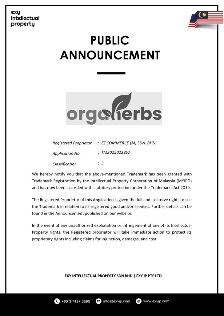 We hereby notify you that the above-mentioned Trademark has been granted with Trademark Registration by the Intellectual Property Corporation of Malaysia (MYIPO) and has now been accorded with statutory protection under the Trademarks Act 2019.