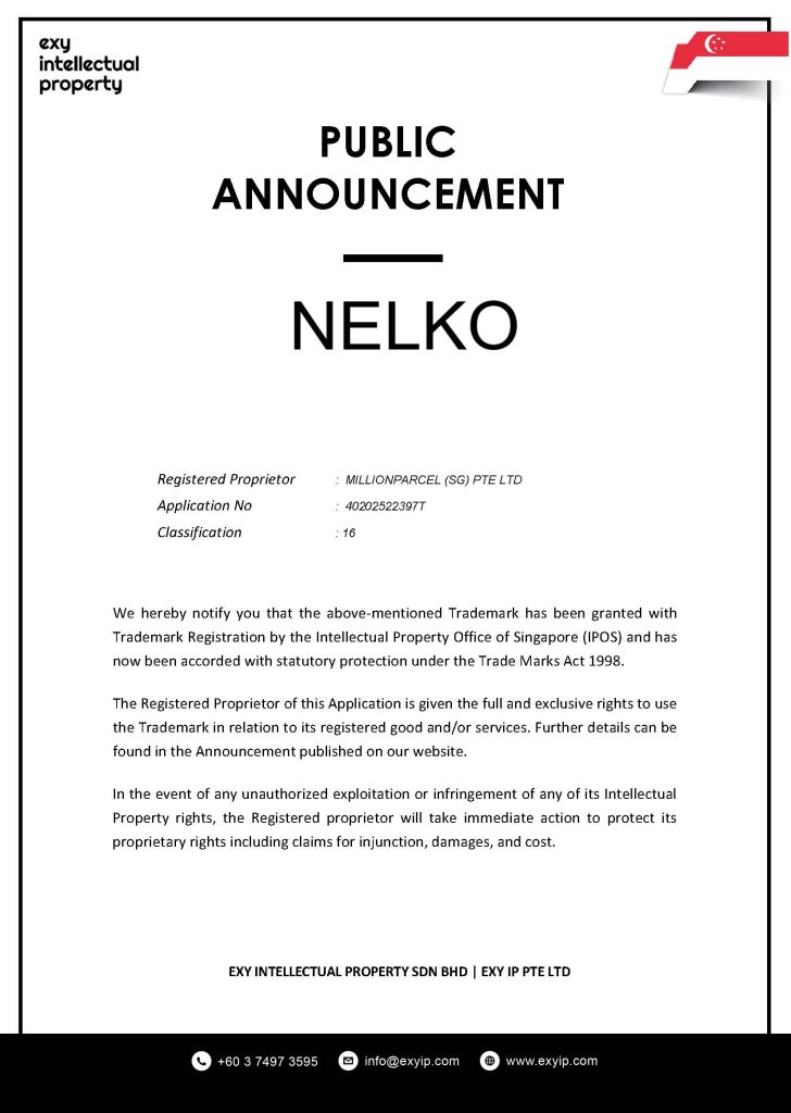 Registered Proprietor: Millionparcel (Sg) Pte Ltd