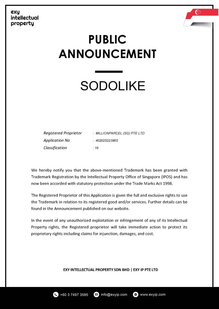 We hereby notify you that the above-mentioned Trademark has been granted with Trademark Registration by the Intellectual Property Office of Singapore (IPOS) and has now been accorded with statutory protection under the Trade Marks Act 1998.