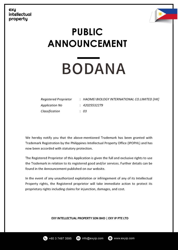 We hereby notify you that the above-mentioned Trademark has been granted with Trademark Registration by the Philippines Intellectual Property Office (IPOPHL) and has now been accorded with statutory protection.